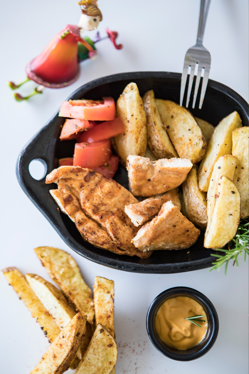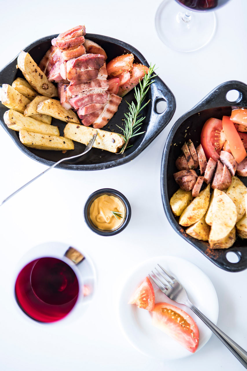 300 grs de costilla ahumada artesanalmente, acompañada de papas fritas y tomate.